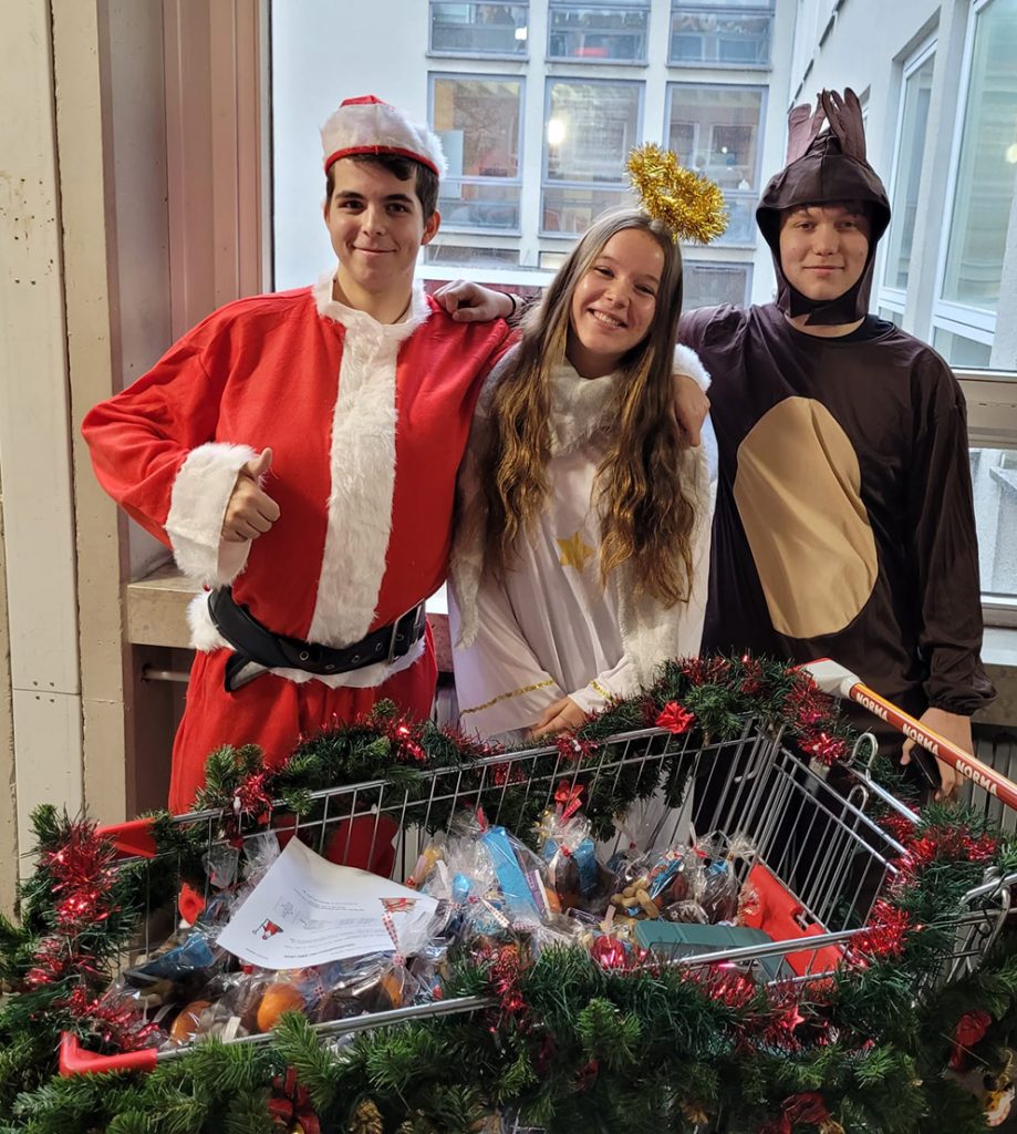 So klang der Slogan unserer diesjährigen Nikolausaktion. Die SMV hat schon eine Woche vor dem Nikolaustag damit begonnen, nette Weihnachtstütchen für alle Schülerinnen und Schüler der 5. und 6. Jahrgangsstufe zu packen. Am 5. Dezember 2025 war es dann endlich so weit und unsere Schülersprecherin Annika und die beiden Schülersprecher Noah und Ben zogen als Rentier, Nikolaus und Engelchen verkleidet durch die Klassenzimmer. Natürlich mussten sich die Schülerinnen und Schüler ihre Belohnung erst verdienen und so sangen sie was das Zeug hielt von der „Weihnachtsbäckerei“ und dem „lieben, guten Nikolaus“. Alle durften dann das Tütchen auspacken und sich über Mandarinen, Nüsse, Schokoladenlollis, Tee und eine kleine Kerze freuen.